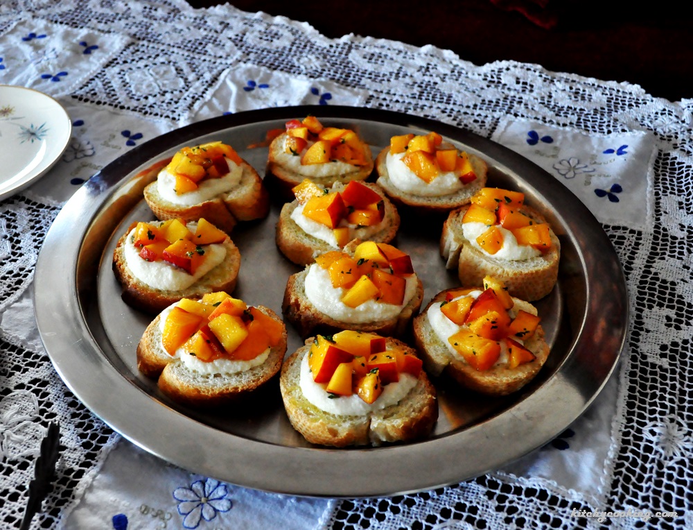 - Spread the ricotta mixture on each slice of bread, top with the peach mixture and serve.